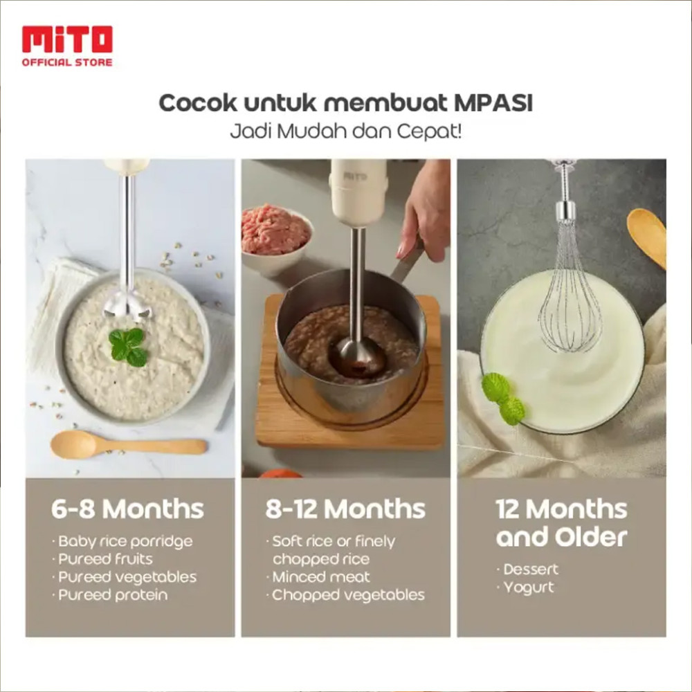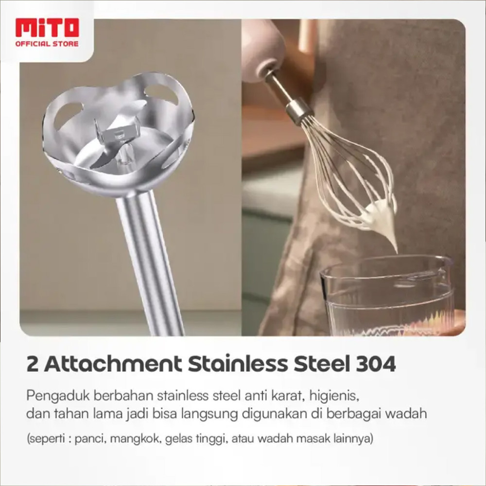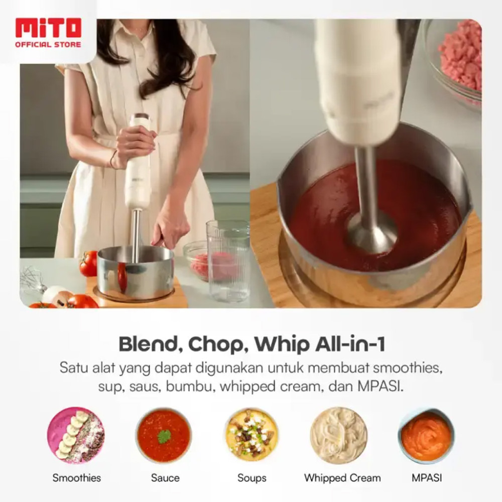 1. Multifungsi 3-in-1: Blend, Chop, Whip! Cocok buat MPASI, smoothies, sup, saus, sampai whipped cream anti gagal.