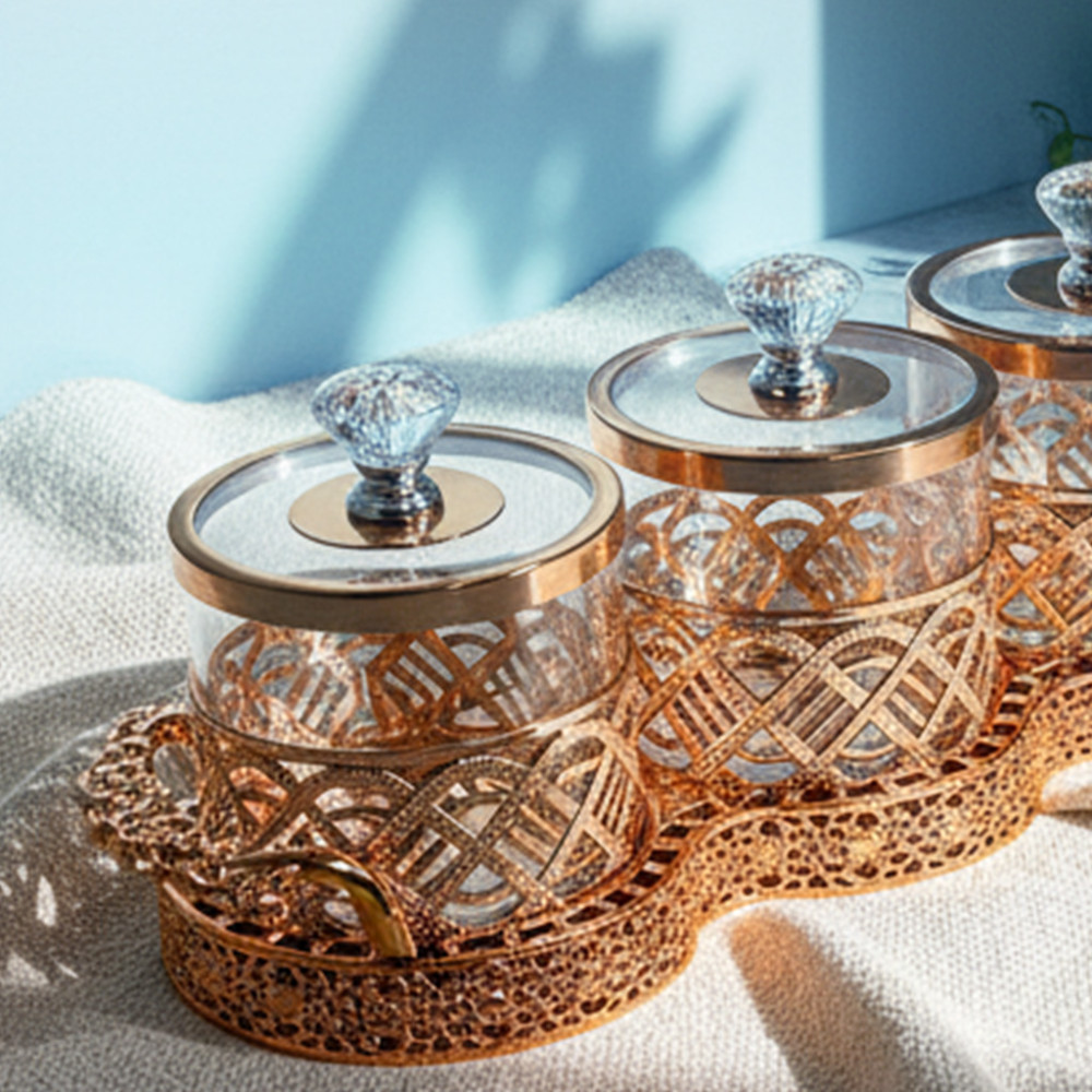 1. Desain set 3-in-1 super mewah, ideal untuk display permen/gula di lobi hotel atau sebagai wadah bumbu premium di rumah.