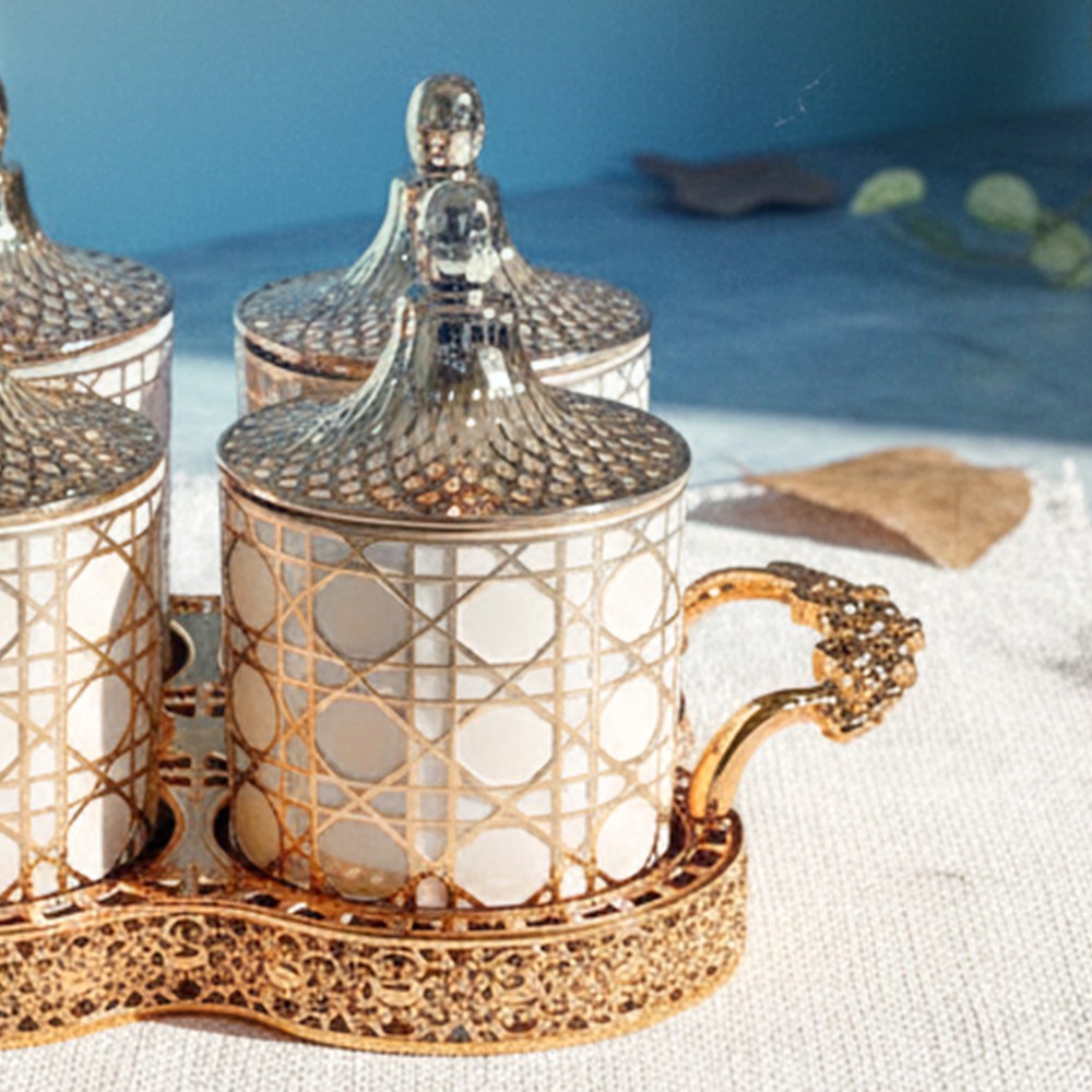 1. Meningkatkan Estetika Meja: Set 4 toples cantik lengkap dengan nampan ukir mawar emas yang membuat penyajian snack atau gula terlihat premium, cocok buat Horeka high-end atau ruang tamu Kakak.