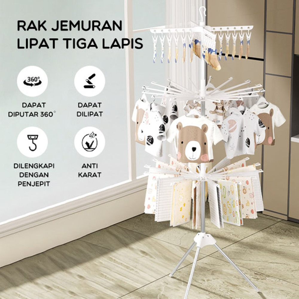 2. Desain 3 tingkat dengan diameter 75 CM. Setiap rak bisa menampung banyak pakaian, dari kaos kaki (area klip atas) hingga pakaian dalam.