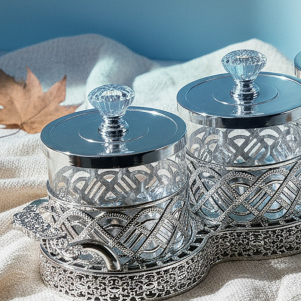 1. Set lengkap 3 toples akrilik bening dengan tray dan holder ukir mewah berlapis silver.