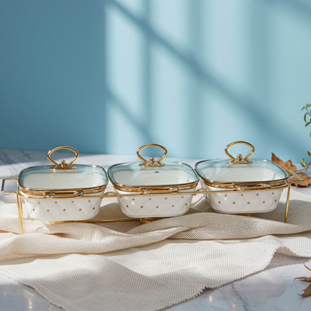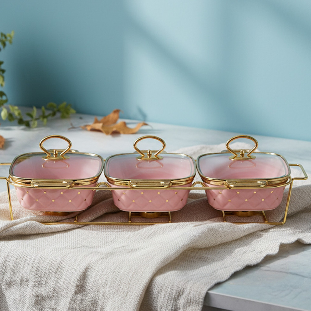 A: 3 pcs Casserole, 3 Glass Lid, dan 1 Gold Metal Stand.