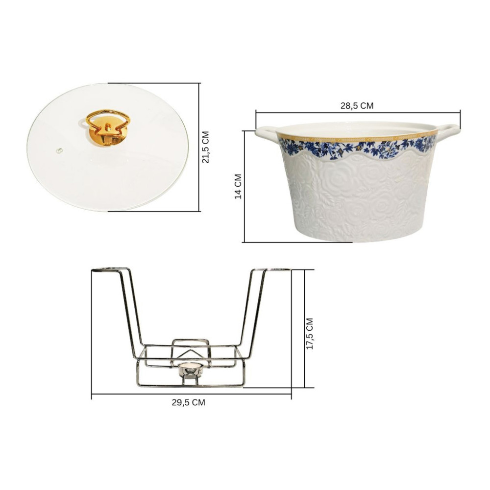 5. Dimensi wadah 23 CM (Diameter), total tinggi (bersama rak) 23.5 CM. Rak besi kokoh (panjang 29.5 CM) menjamin penyajian stabil.