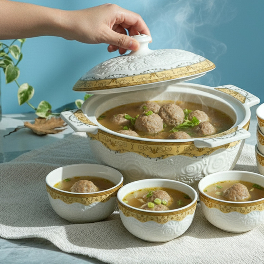 Pusing cari wadah sup yang elegan tapi porsinya pas buat keluarga besar atau resto Kak? VICENZA SOUP TUREEN 8PCS S90 (6) ini bikin penyajian auto mewah, bukan kaleng-kaleng! Dijamin tamu atau pelanggan Kakak akan bilang, "Ihh, berkelas banget deh!" Iya kan Kak??