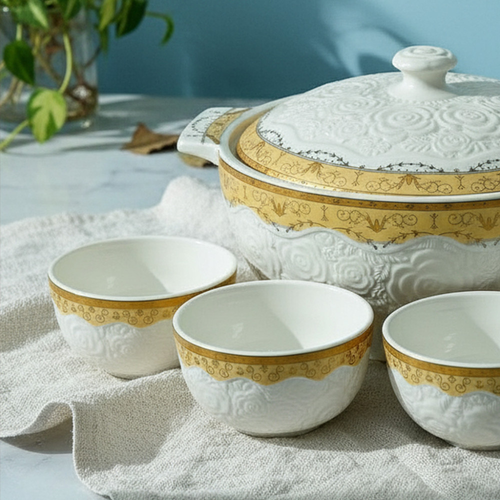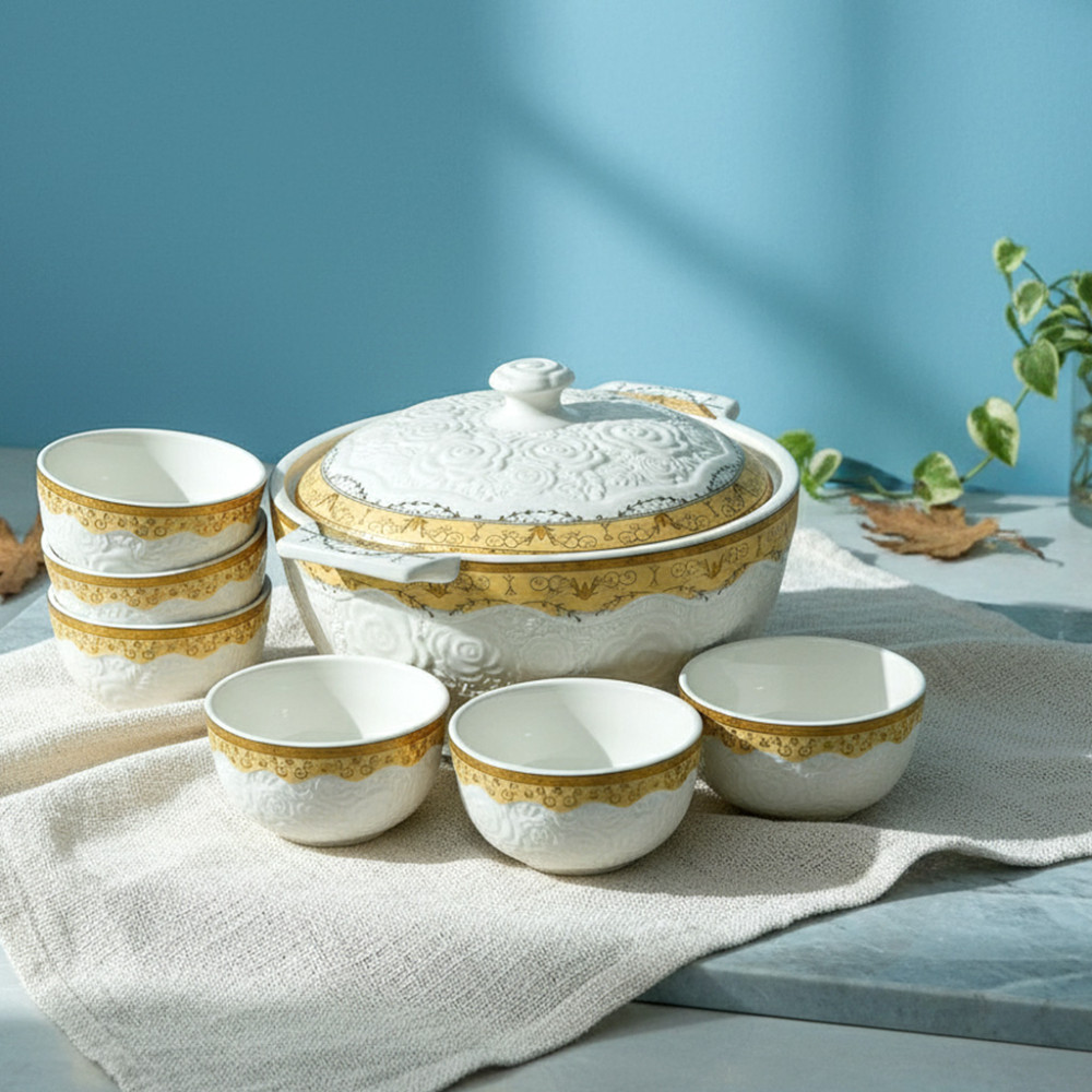 5. Set lengkap 8 Pcs: 1 Mangkok Besar, 1 Cover, 6 Mangkok Kecil. Praktis, hemat, dan siap pamer!