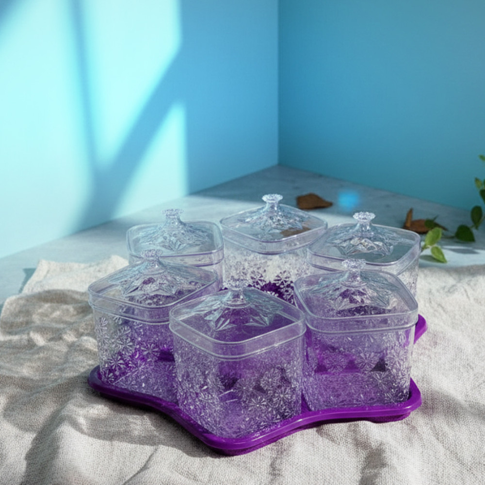 1. Terdiri dari 6 toples kotak dengan tutup dan 1 baki penyajian berwarna biru cerah. Praktis buat naruh nastar, permen, atau kacang-kacangan saat ada acara. Nggak perlu ribet angkat satu-satu!