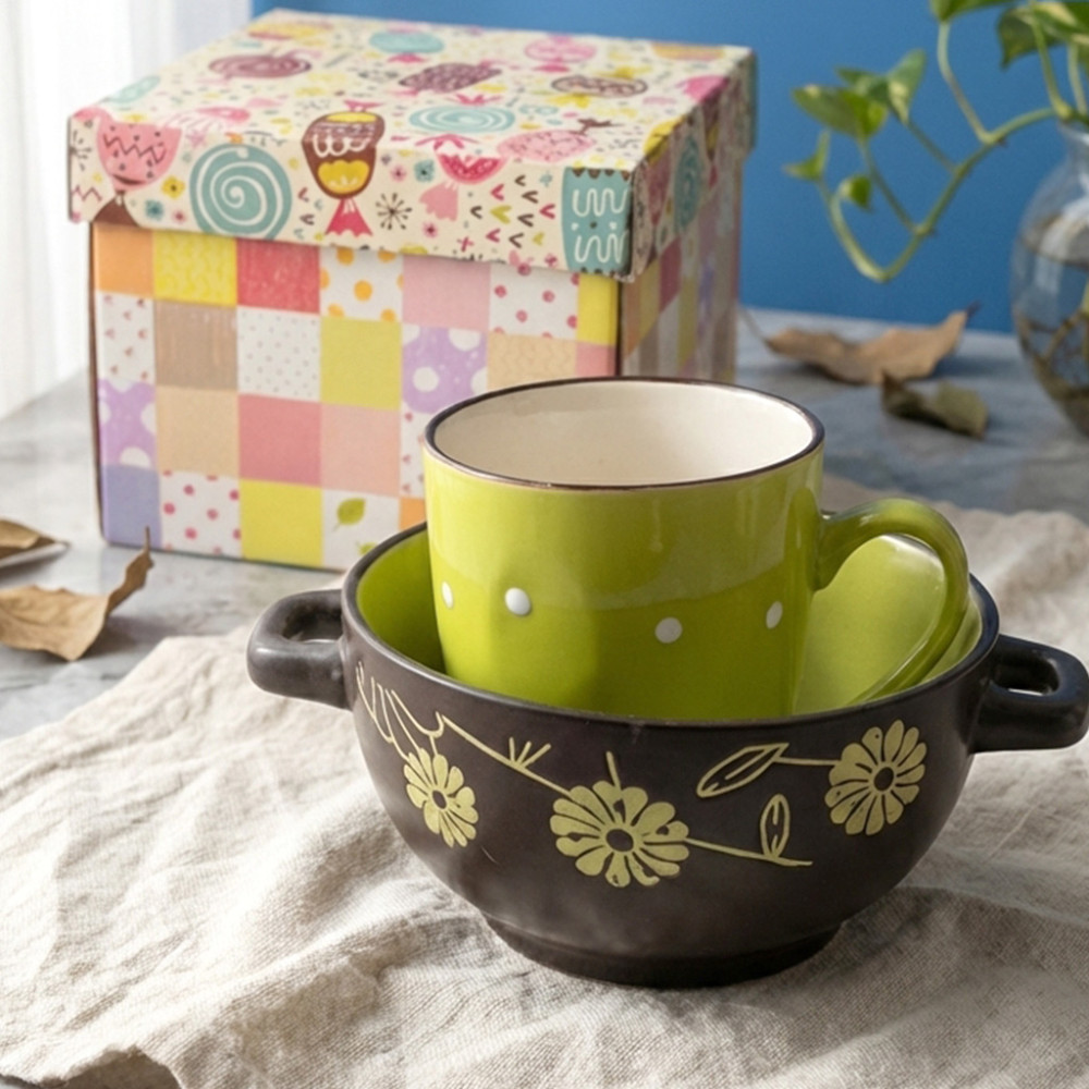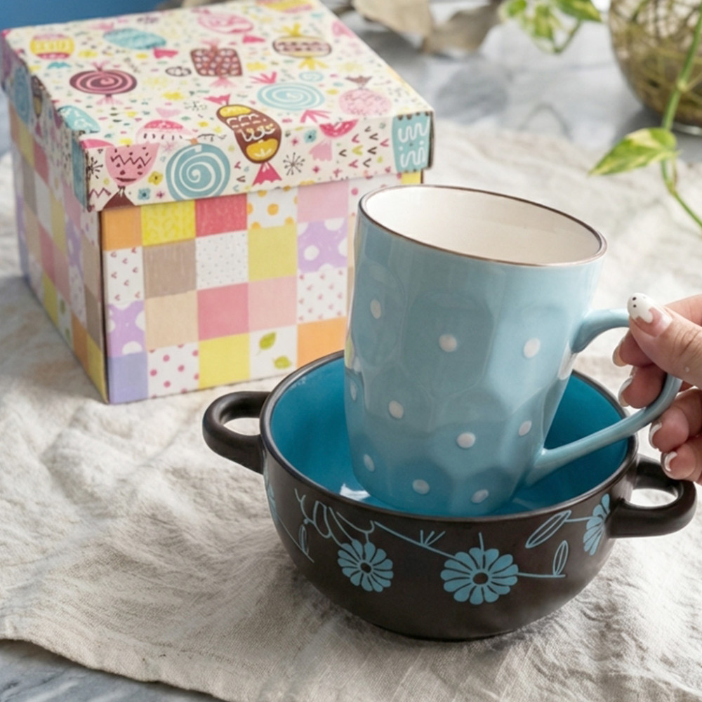 Liat deh fotonya, perpaduan mangkok kuping coklat motif bunga estetik sama mug polkadot pastel (hijau & biru) ini beneran bikin melting 😭💖. Kalo nyajiin makanan pake alat makan buluk, ihh anoying banget deh kak! Mending pake set keramik ini. Mangkoknya punya handle kuping, tangan Kakak aman dari panas pas makan mie rebus atau soto. Udah dapet box gemes juga, siap dikasih ke camer tanpa repot bungkus! 🍜☕