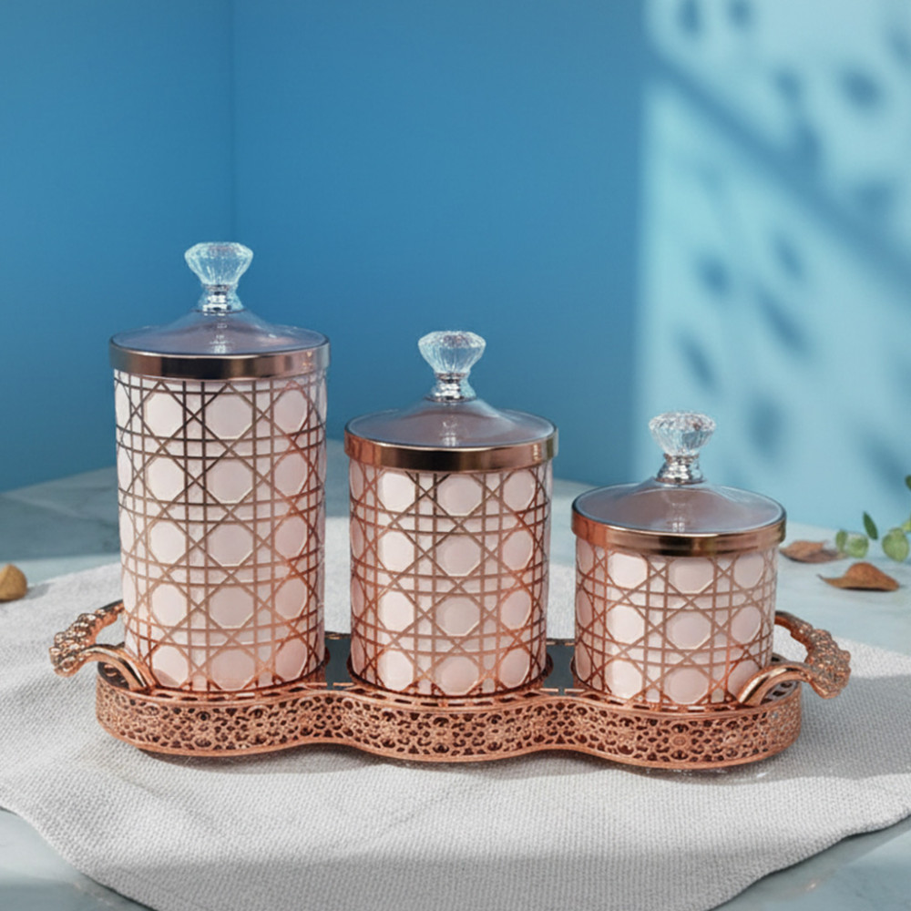 3. Motif rattan klasik warna White Gold atau Rose Gold (tergantung stok ya Kak!) bikin toples ini auto-mewah, cocok banget buat di dapur maupun di etalase kafe Kakak.