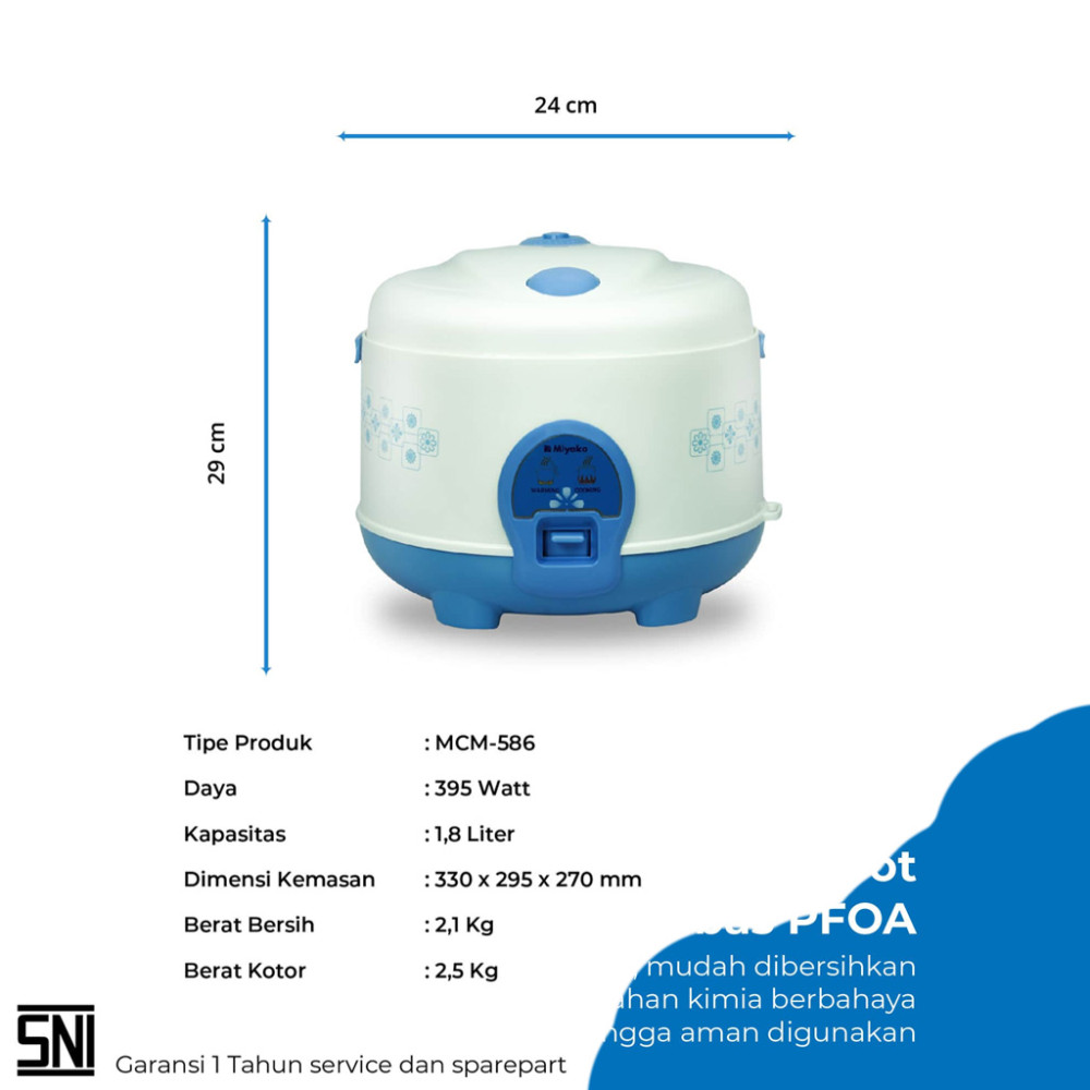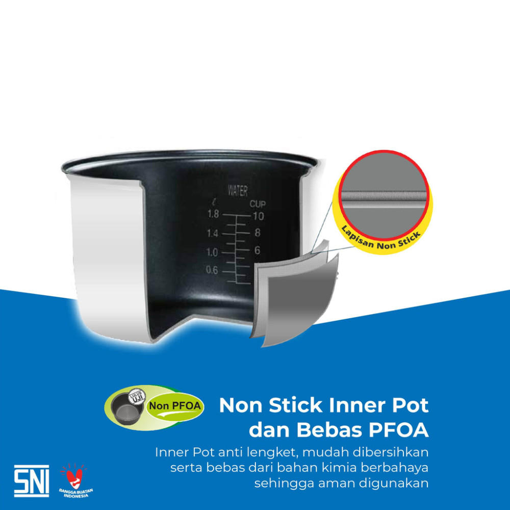 1. Kapasitas 1.8 Liter. Porsi pas buat sajian keluarga atau warung makan. Dijamin nasi matang merata.