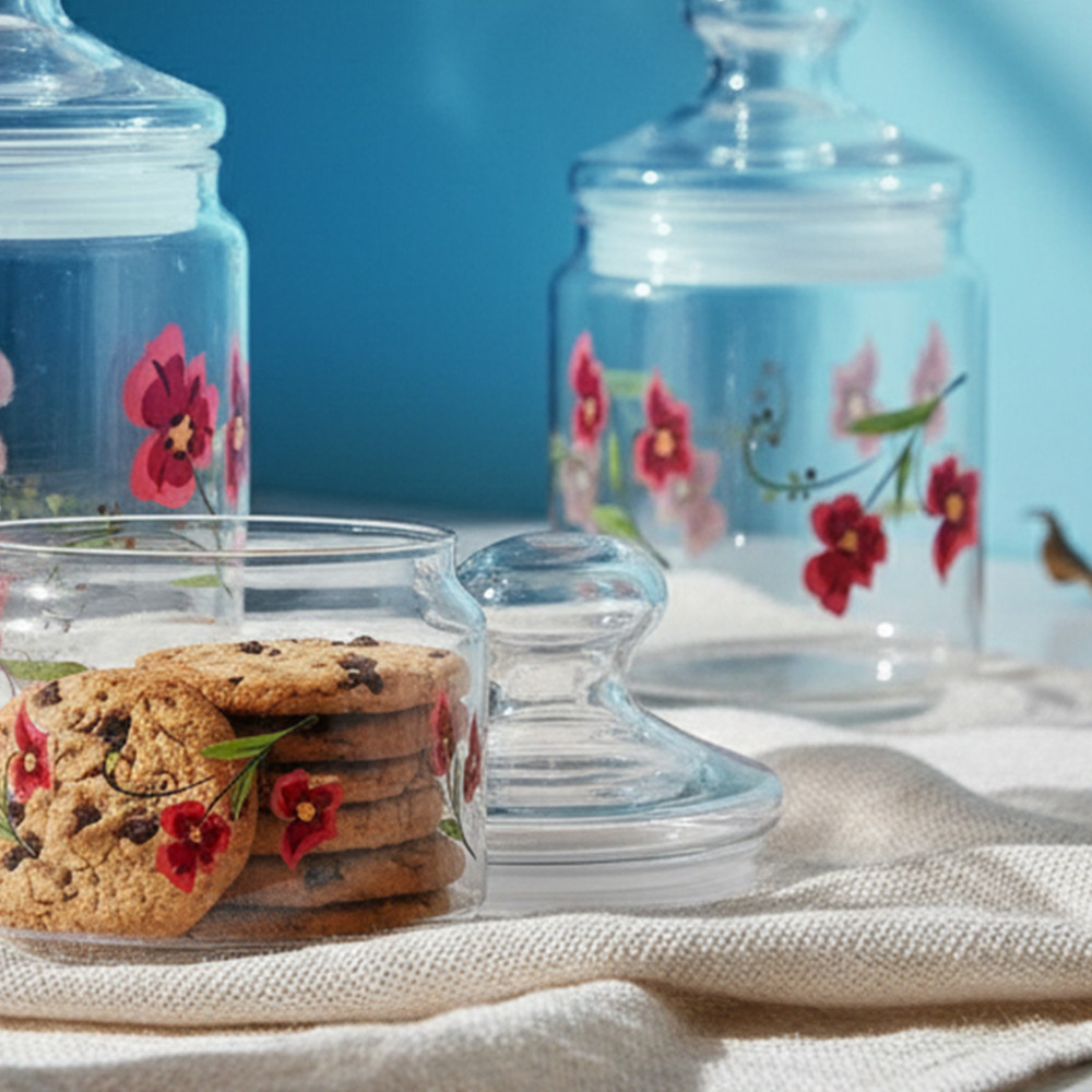 3. Desain tutup kaca yang elegan dan fungsional, menjaga kesegaran maksimal untuk berbagai cemilan, bumbu, atau bahan kering lainnya. Anti semut nakal yang suka ikutan nyemil! 👋