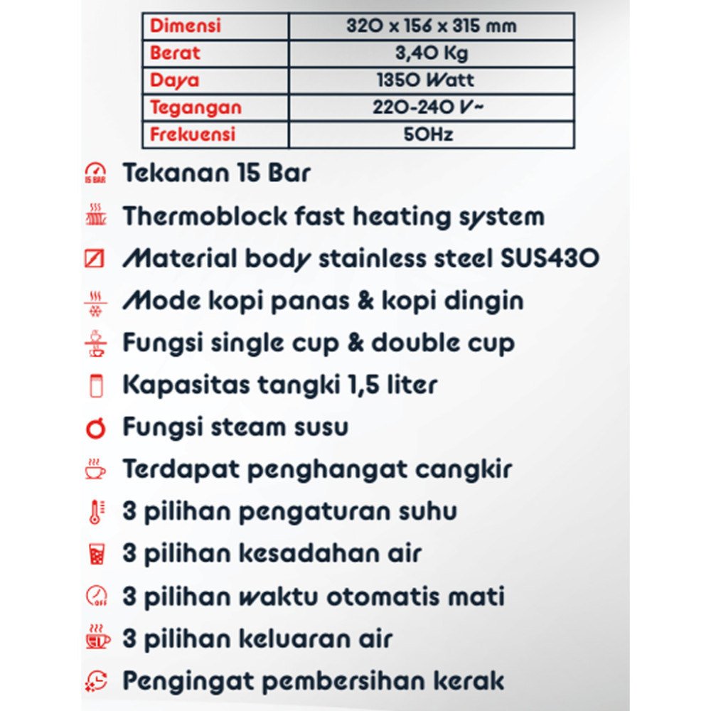 2. Daya 1350 Watt (Tegangan 220-240 V~). Cepat panas berkat Thermoblock fast heating system. Siap seduh tanpa drama nunggu lama.