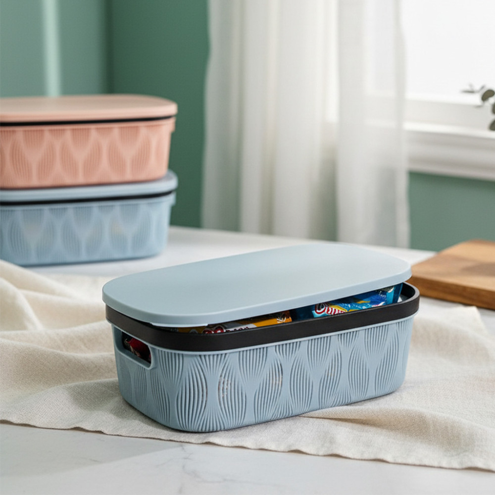 2. Dilengkapi tutup yang rapat, bikin isi keranjang aman dari debu bandel. Plus, desain tutupnya datar, jadi enak buat ditumpuk (Stackable) tanpa goyang. Hemat ruang vertikal!