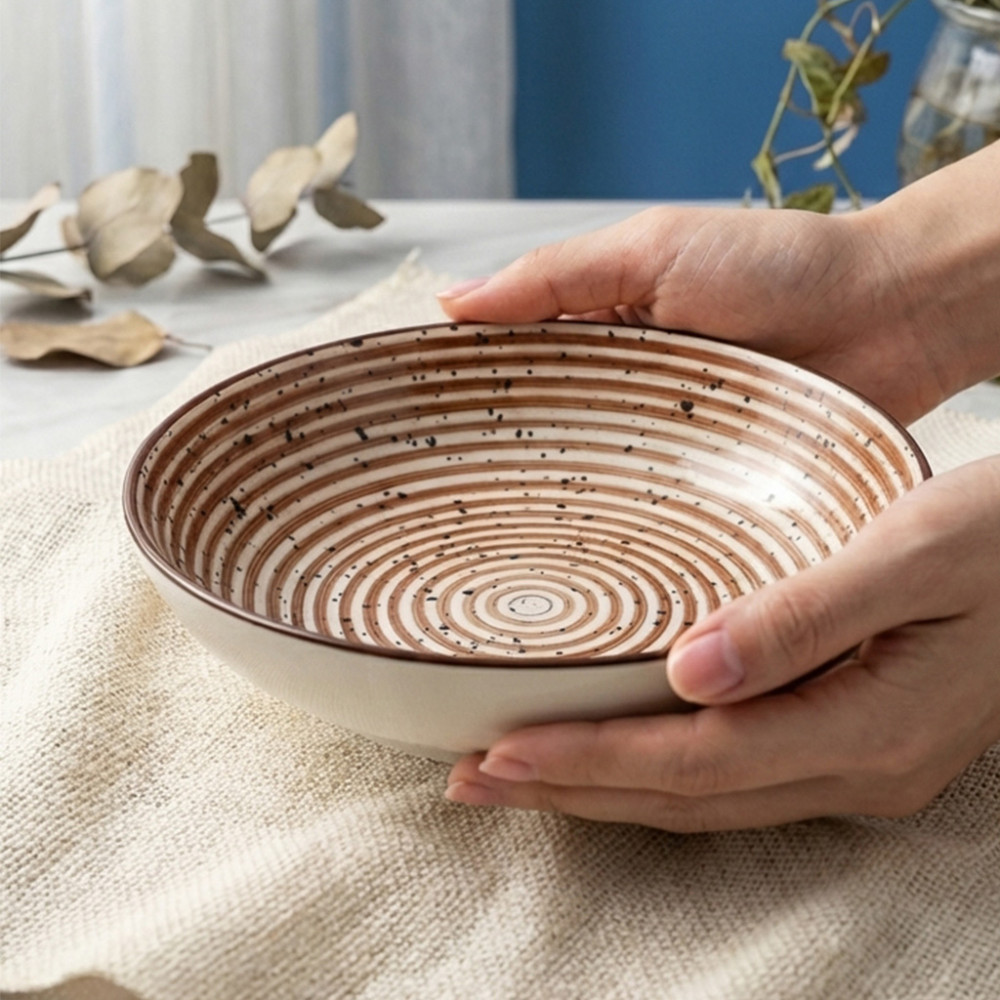 Bosan sama piring polos yang gitu-gitu aja? Ihh anoying banget deh kak kalau meja makan kelihatan pucat pas ada tamu. Piring estetik dengan motif spiral coklat ini siap bikin level plating kakak naik kelas seketika!