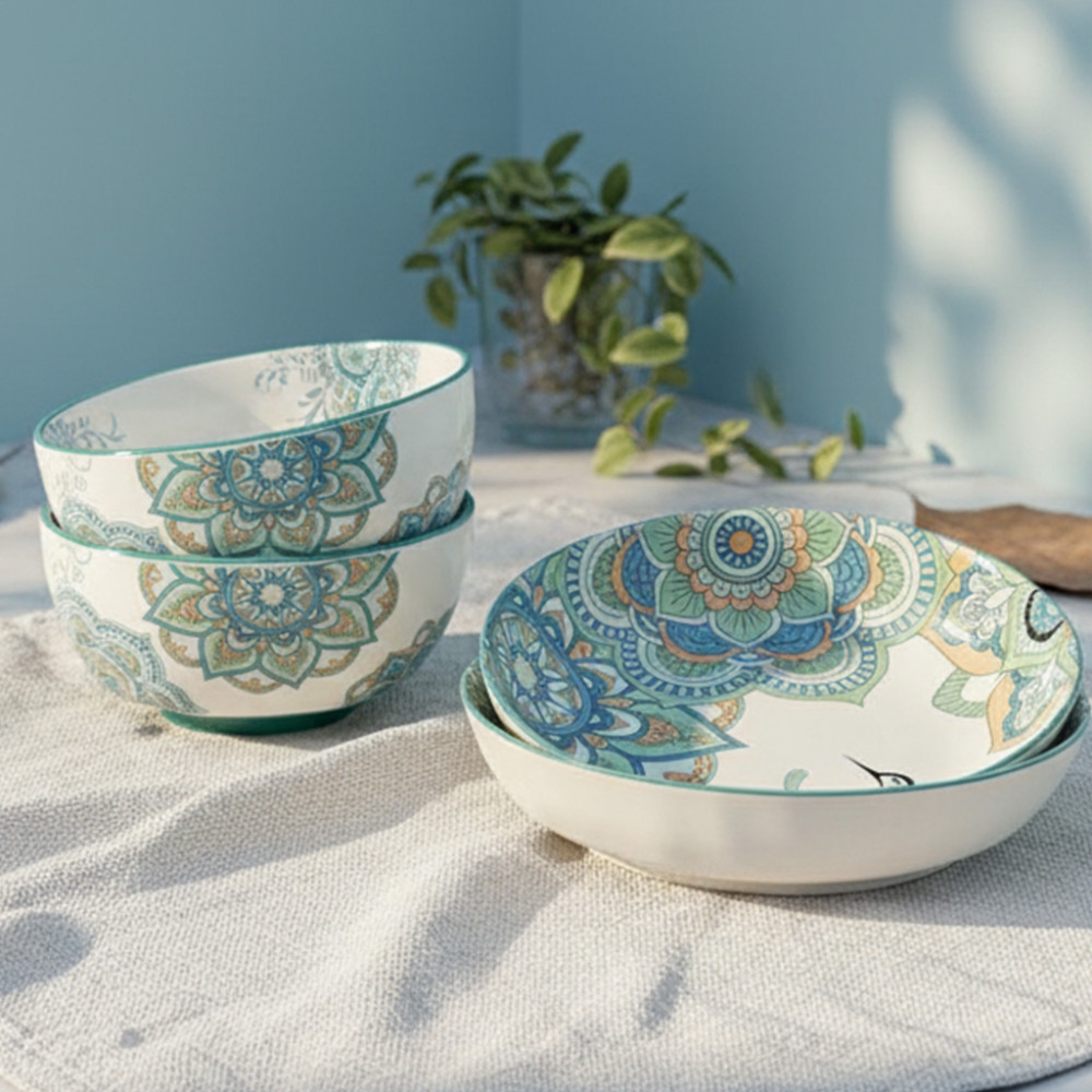 Kakak lagi pusing cari hampers lebaran atau kado pernikahan yang estetiknya maksimal tapi harganya tetap masuk akal? Atau Bos Horeka lagi butuh tableware buat nambah aura bohemian di kafe? Set keramik ini jawabannya! Tampilan 'SWEET LIFE' motif Mandala-nya bikin nafsu makan naik 100%, dijamin feed IG Kafe kakak langsung banjir like! 😍