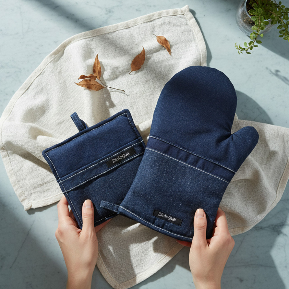 DIALOGUE CEMPAL TANGAN SET DLC2323 (120). Capek kan Kak, kalau sarung tangan oven cepet bolong? Ini solusi premium tahan banting! Desainnya elegan kayak denim. Cocok buat dapur profesional (Horeka) atau gaya estetik di rumah. Betul kan Kak? 💯