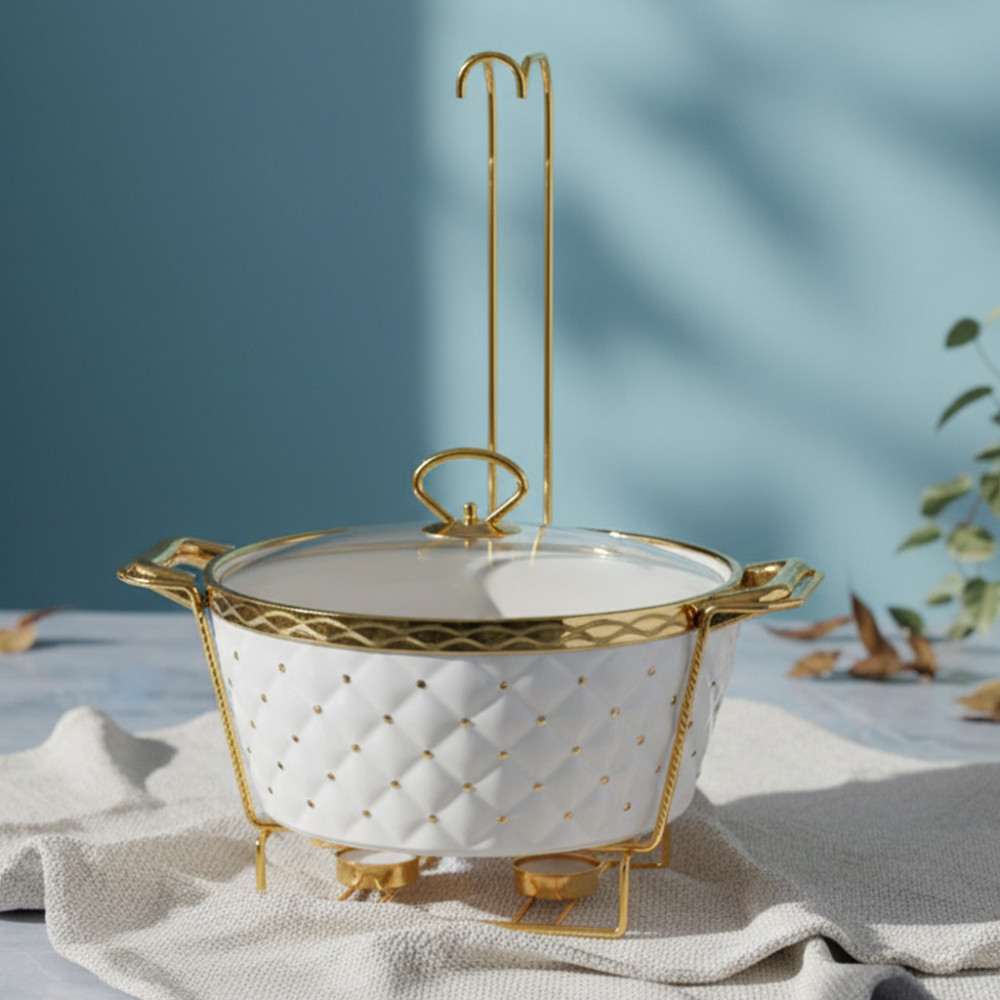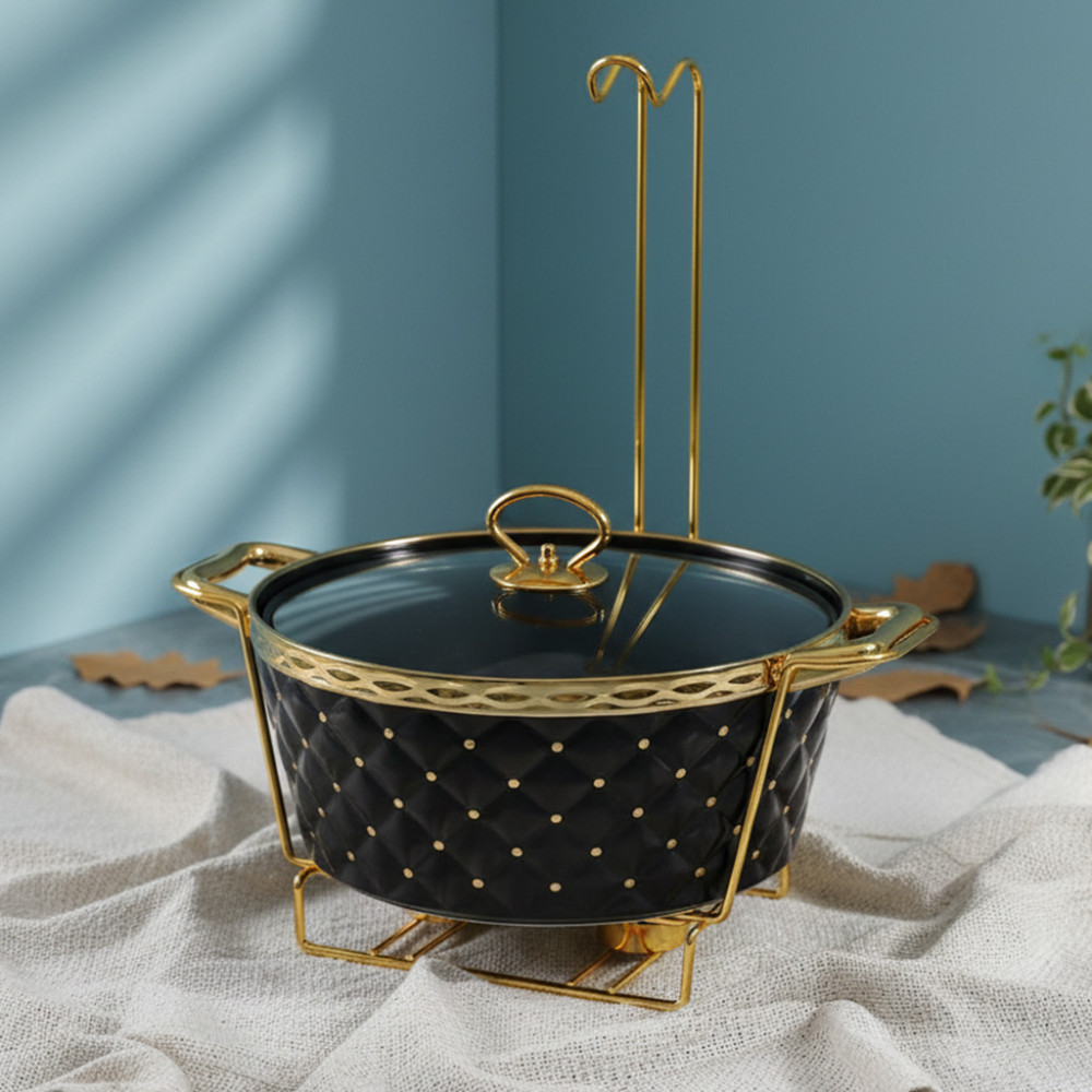 2. Bodi keramik premium dengan desain embos perpaduan dot gold yang elegan, menjamin hidangan tetap hangat merata. Tampilan mahal, harga nggak bikin dompet Kakak teriak!
