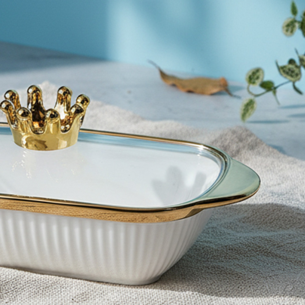 3. Aksen emas di tepian piring dan tutup/pegangan mahkota, anti luntur, membuat hidangan Kakak terlihat berkelas banget.