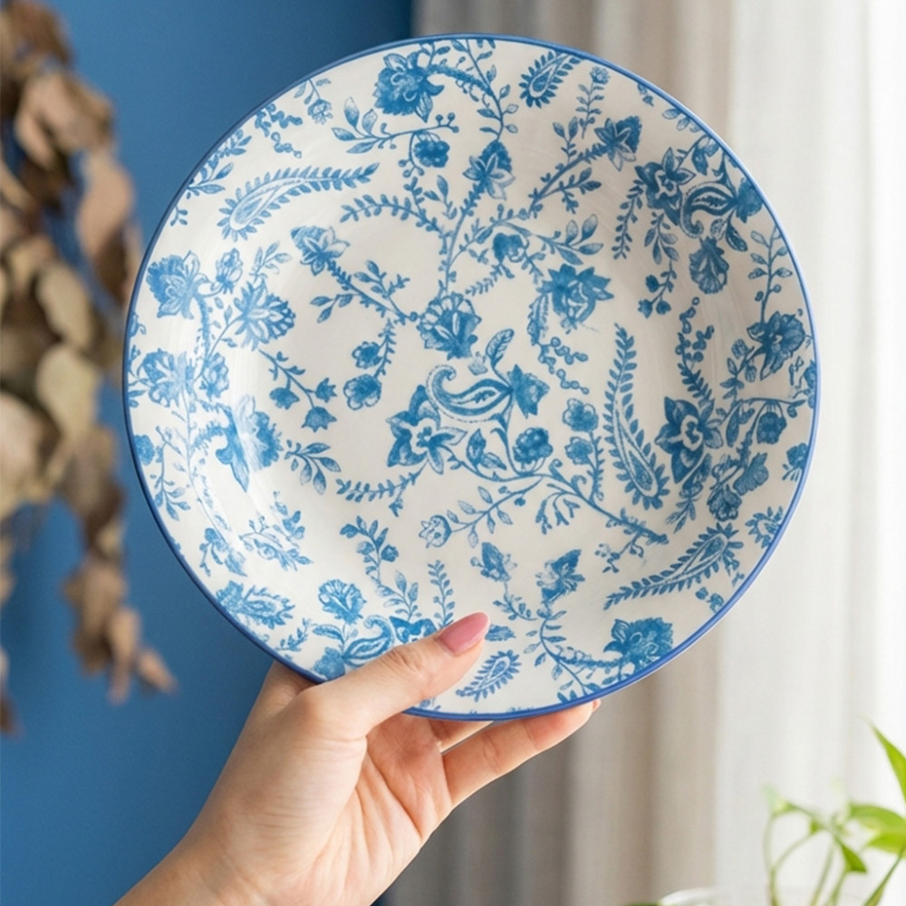 2. Motif floral biru klasik yang detailnya rapi banget, bikin meja makan Kakak auto terlihat premium seperti di restoran bintang lima.