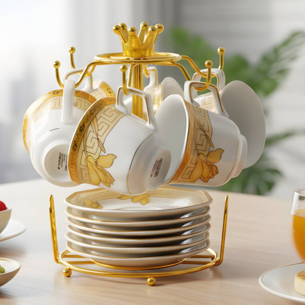 1. Set 13 Pcs lengkap: 6 Cangkir + 6 Lepek + 1 Rak Display Mahkota. Praktis dan hemat ruang banget!