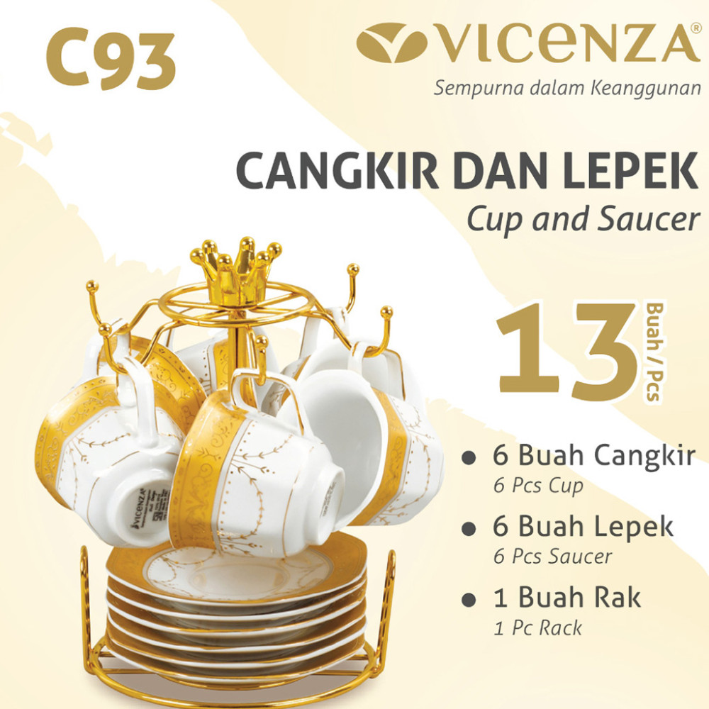 VICENZA CANGKIR LEPEK 13PCS C93. Aduh, ini sih bukan set cangkir biasa, ini properti buat ratu! Kalau pakai ini, ngopi sore auto berasa di istana. Bener kah? 👑 Set 13 Pcs keramik gold mewah ini wajib banget ada di rumah ibuk ibuk atau kafe premium Kakak.