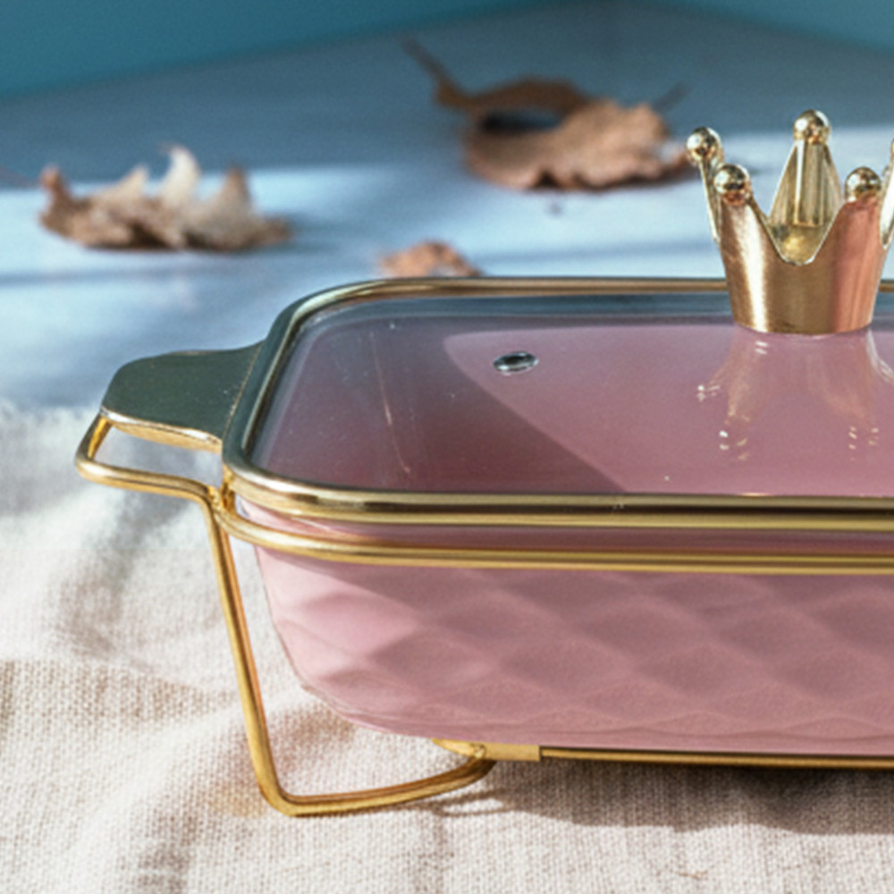 1. Keramik Pink Mewah: Wadah keramik food grade dengan finishing pink glossy super cantik. Eksterior bertekstur diamond membuat hidangan tampil glamor dan tidak mudah licin saat dipegang. Aman untuk oven dan microwave (tanpa stand).