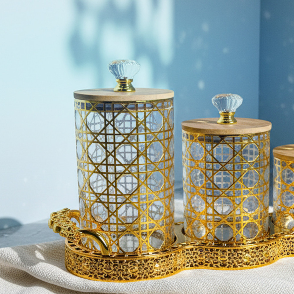 1. Set 3 toples bahan AKRILIK silinder premium dengan ornamen emas motif Cannage yang elegan. Desain ini bikin apapun isinya jadi terlihat mahal. Bener kah?