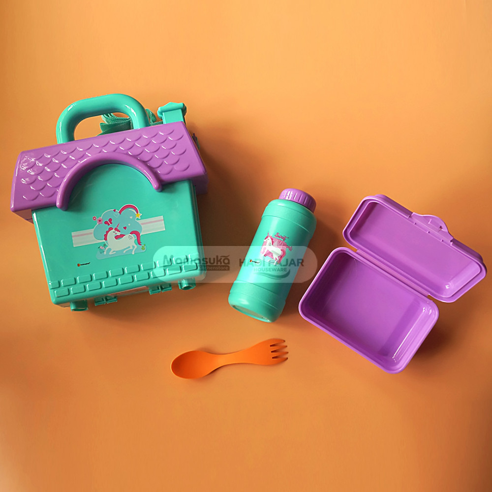 Didalamnya terdapat tempat makan, botol minum, sendok, dan garpu. pada bagian atas terdapat gagang yang bisa membantu si kecil dalam menenteng