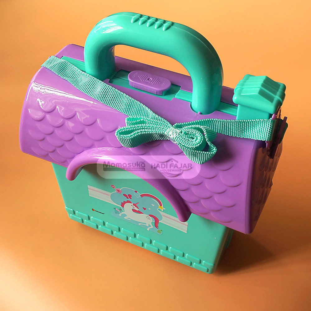 Tidak perlu kuatir ribet untuk dibawa karena school box ini didesain dengan pas box-nya untuk membawa kotak makan dan botol minum. Selain itu terdapat tas/cover box dan strap tali agar mudah di bawa.